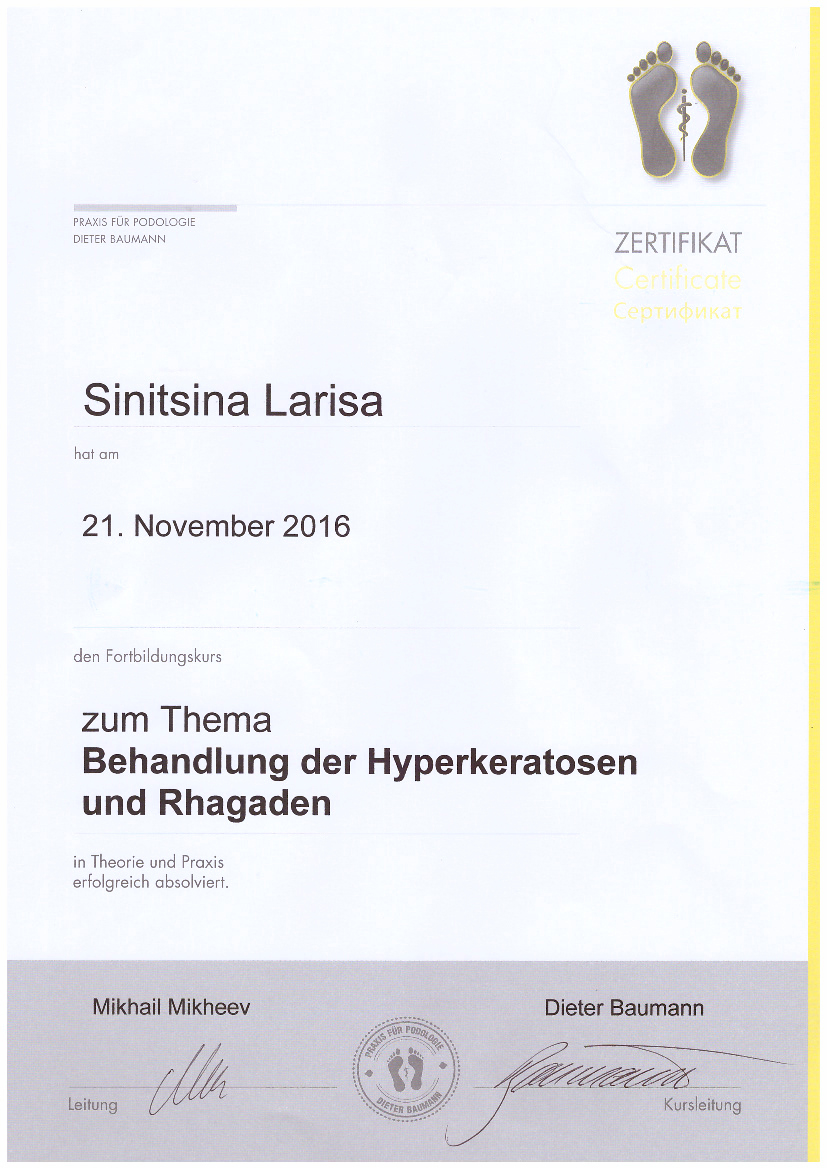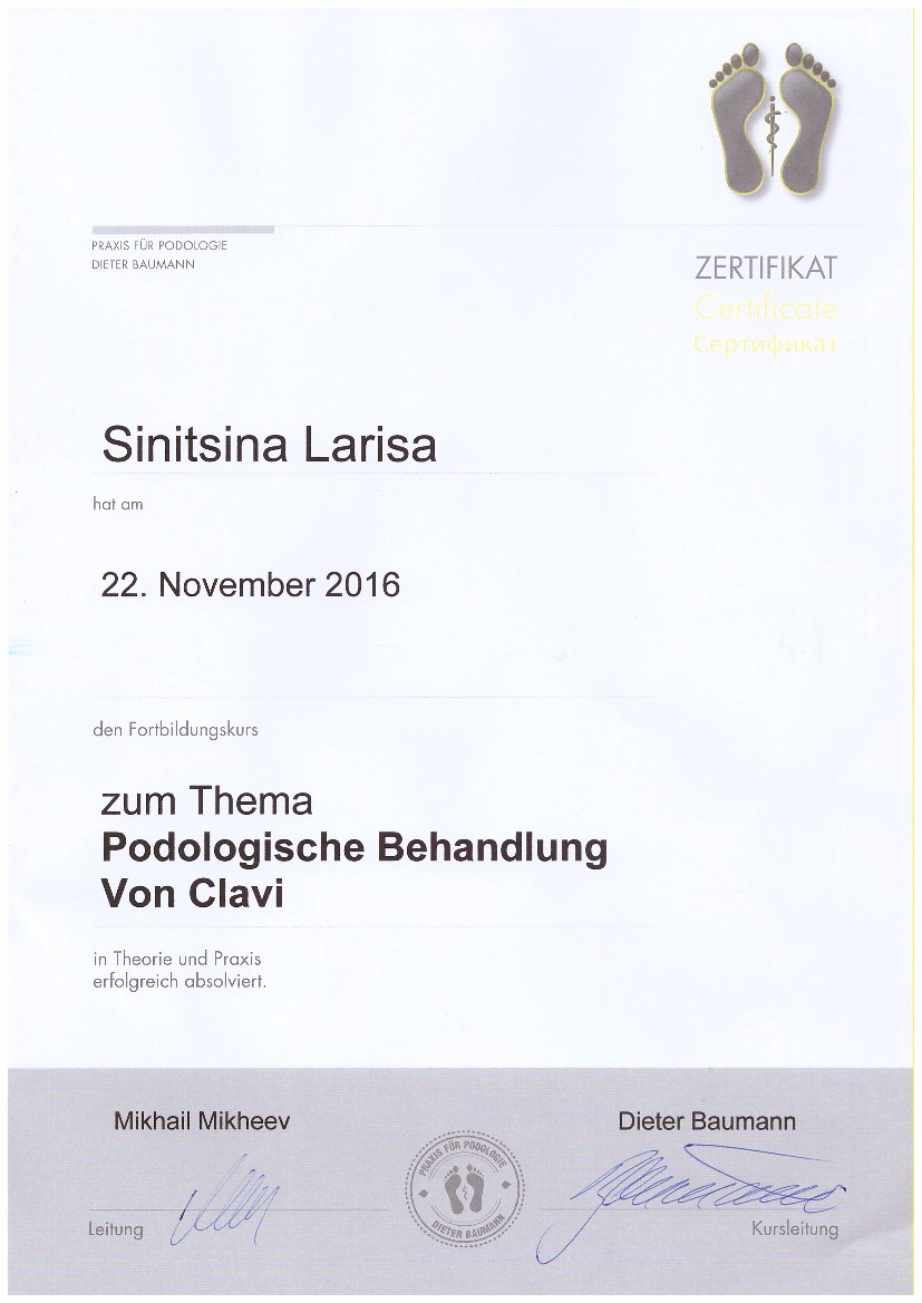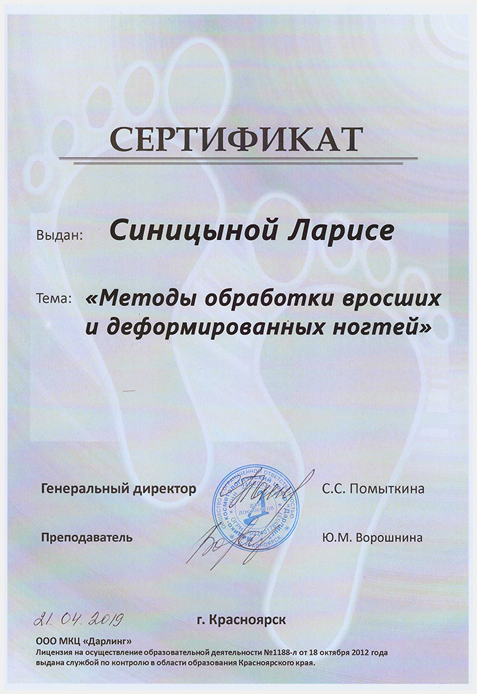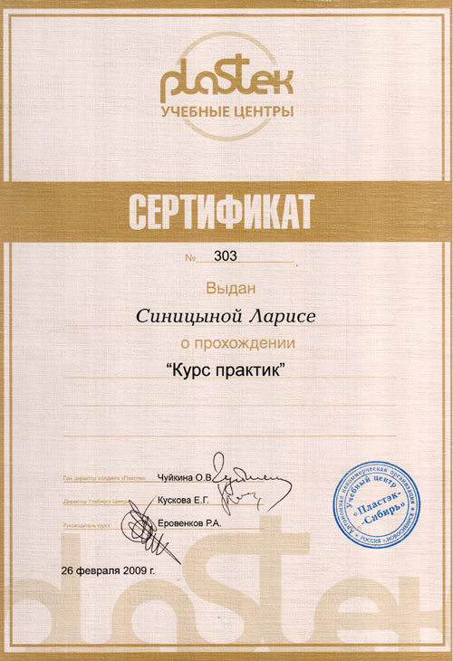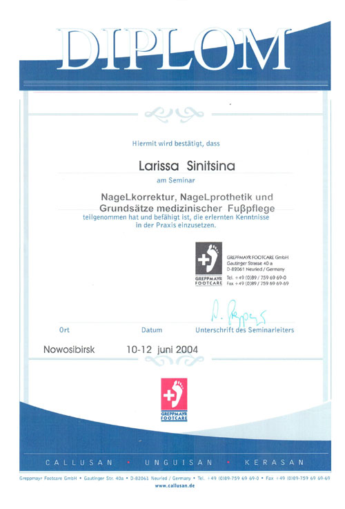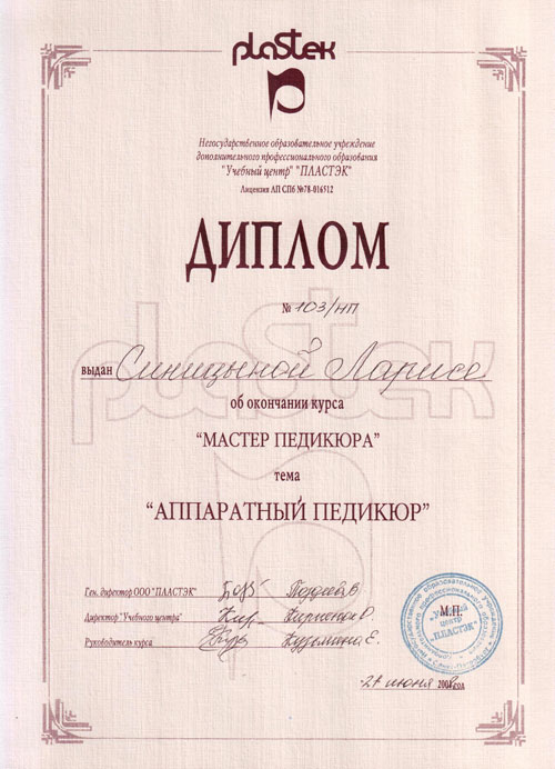 2002 г. - Прошла обучение в НОУ "Учебный центр "Пластек" г. Новосибирск по курсу: "Аппаратный педикюр". Присвоена квалификация "Мастер педикюра".