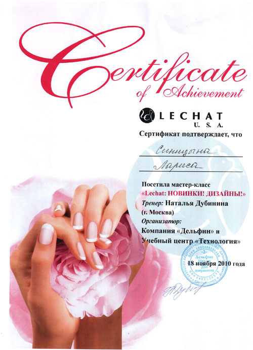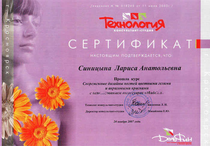 2007 г. - Прошла курс по программе: "Современные дизайны ногтей цветными гелями и акриловыми красками".