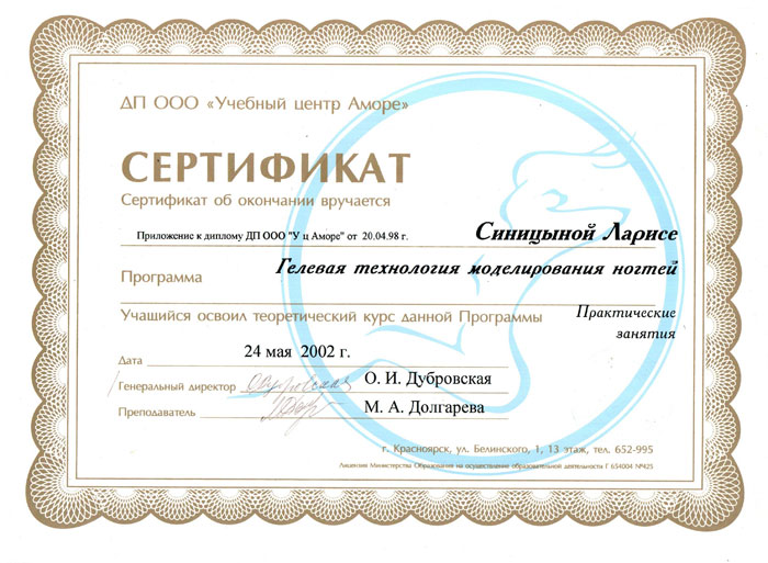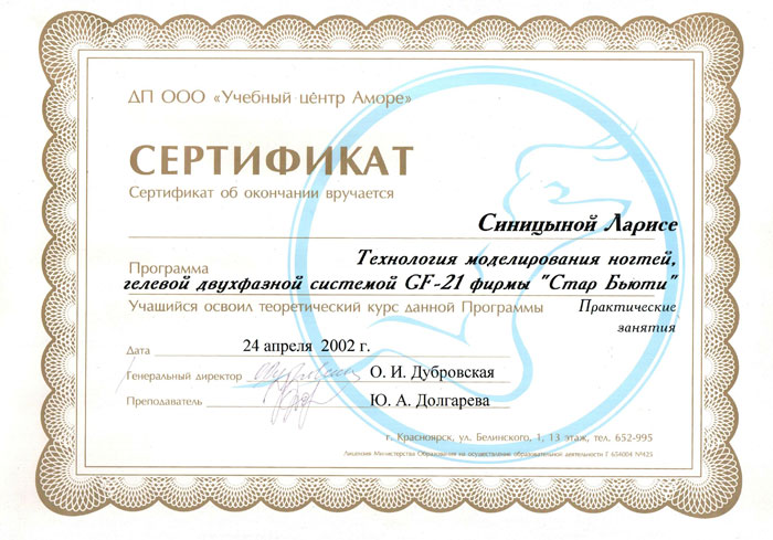 2002 г. - Освоила курс по программе: "Технология моделирования ногтей",гелевой двухфазной системой GF-21 фирмы "Стар Бьюти" в ДП ООО "Учебный центр "Аморе".