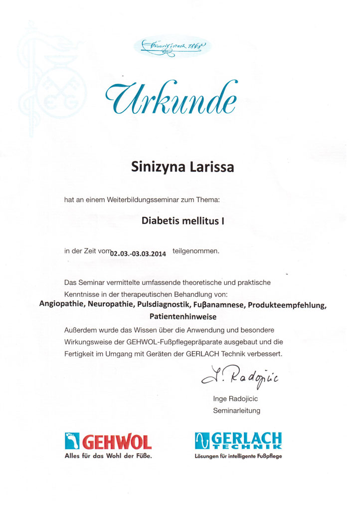 2014 г. - Успешно прошла базовый курс и практический тренинг авторского курса Инге Радожичич (Германия) в цикле Суперпрофи по двум тематическим блокам: "Обработка проблемных ногтей. Протезирование ногтей. Диабетическая стопа" в Учебном Центре "Пластэк - Сибирь".