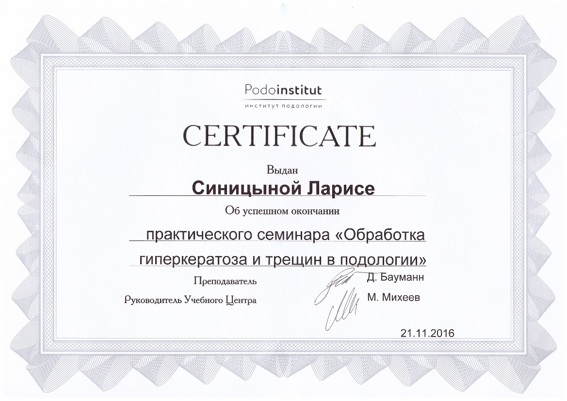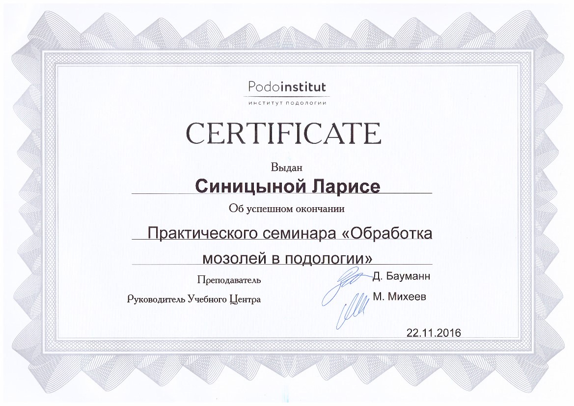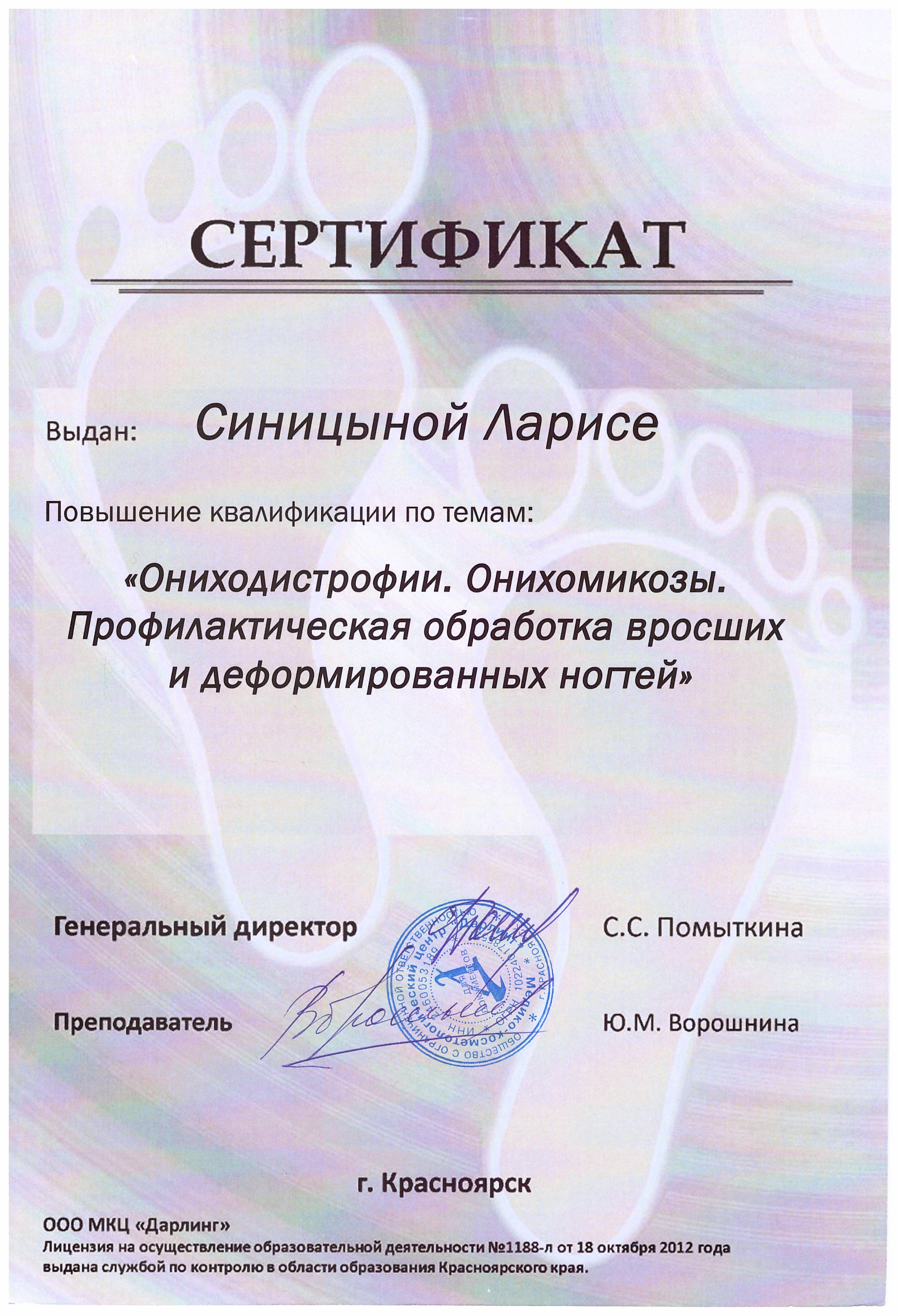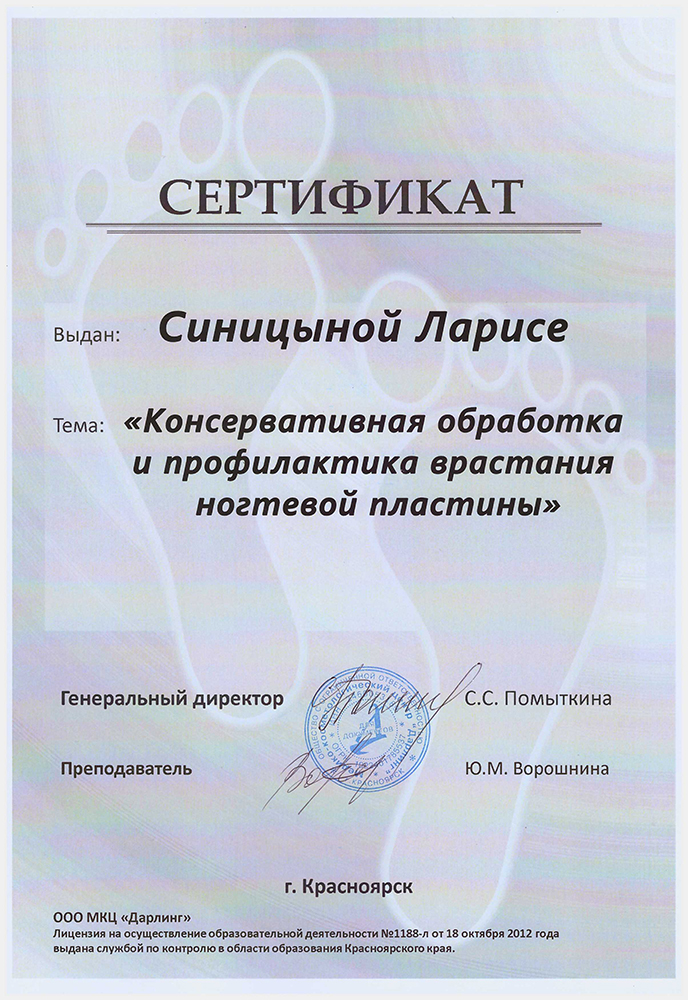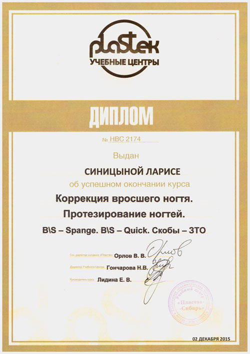 2015 г. - Успешно закончила обучающий курс по теме: "Коррекция вросшего ногтя. Протезирование ногтей". B/S-Spange/ B/S - Quick/ Скобы - ЗТО " в учебном центре "Plastek".
