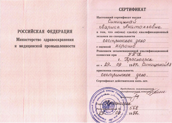 1997 г. - Повышение квалификации в УПК г. Красноярска,присвоена квалификация "Сестринское дело"