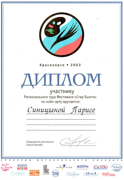 2002 г. - Участник Регионального тура Фестиваля "Стар Бьюти" по нэйл - арту.