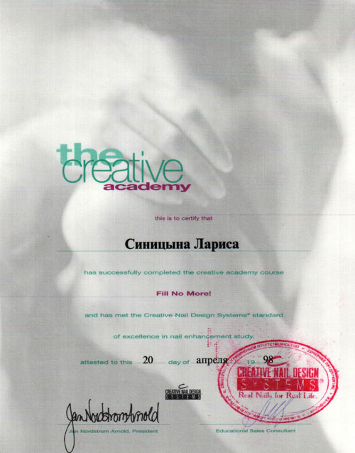 1998 г. – Закончила курс наращивания ногтей по акриловой технологии в Учебном центре «Аморе - Красноярск». По окончании присвоена специальность «Мастер по наращиванию ногтей»