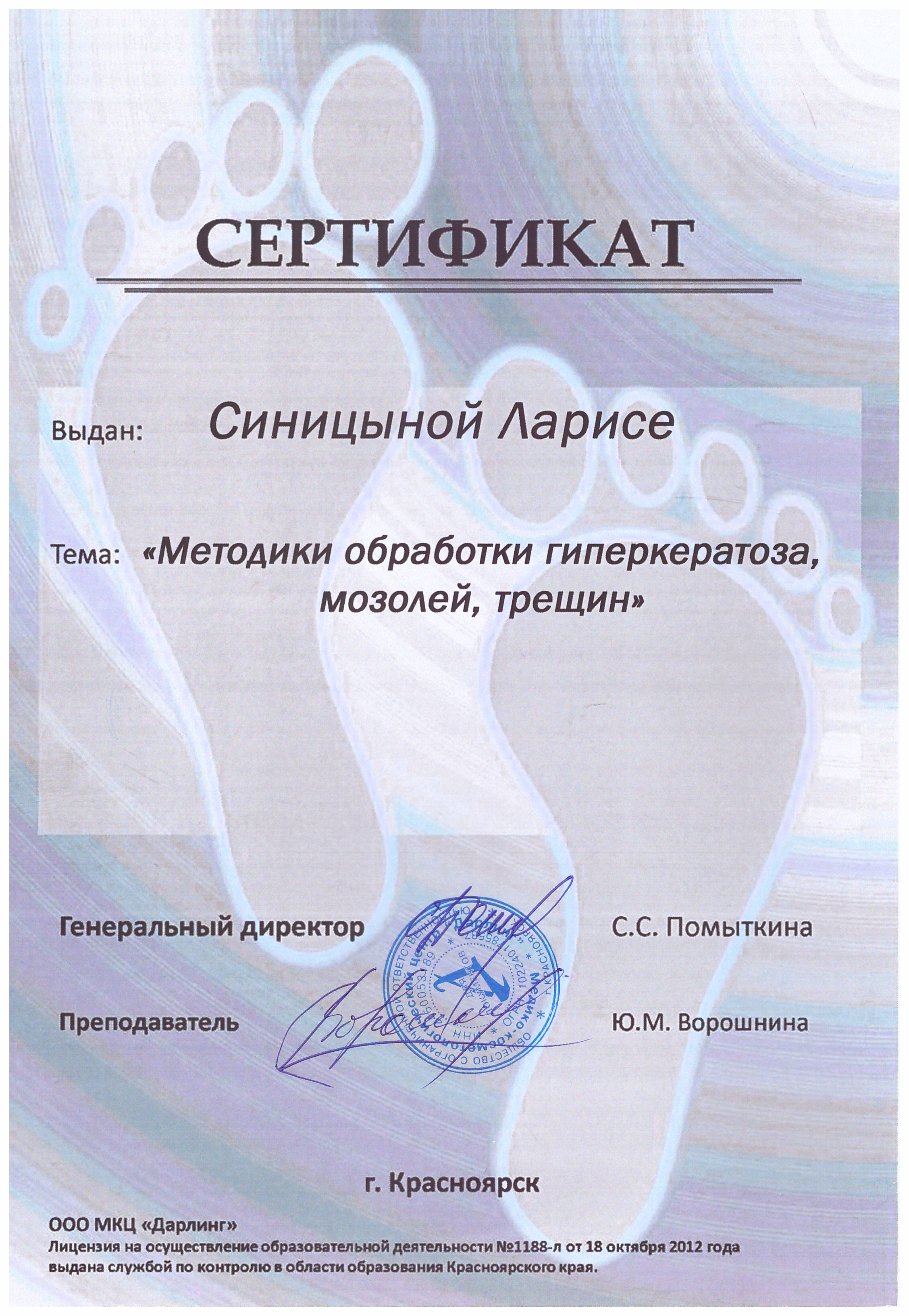 2008 г. - Прошла обучающий курс "Мастер педикюра" с практической отработкой по теме "Аппаратный педикюр" в Учебном Центре "Пластэк - Сибирь".