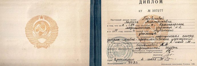 1988 г. - Закончила Красноярское медицинское училище №2 по специальности медицинская сестра.