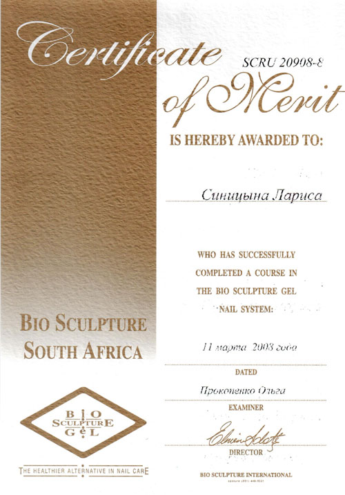 2003 г. - Прошла курс обучения по программе: "Bio Sculpture Gel".