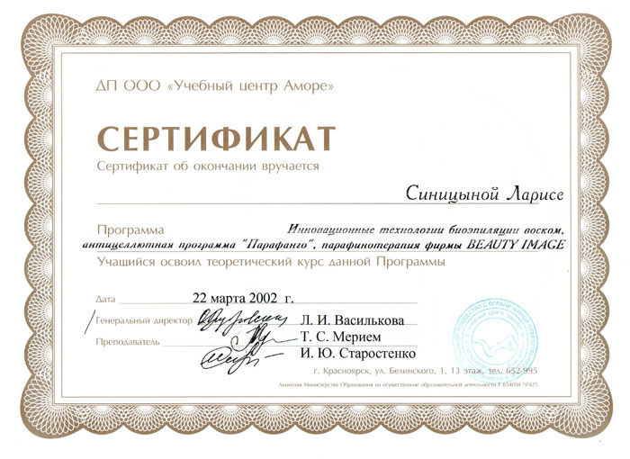 2002 г. - Прошла обучение по программе:"Инновационные технологии биоэпиляции воском, антицеллюлитная программа "Парафанго", парафинотерапия фирмы BEAYTI IMIGE в ДП ООО "Учебный центр "Аморе".