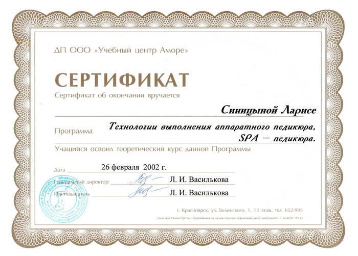 2002 г. - Прошла обучение по программе: "Технологии выполнения аппаратного педикюра", СПА педикюра" в ДП ООО "Учебный центр "Аморе".