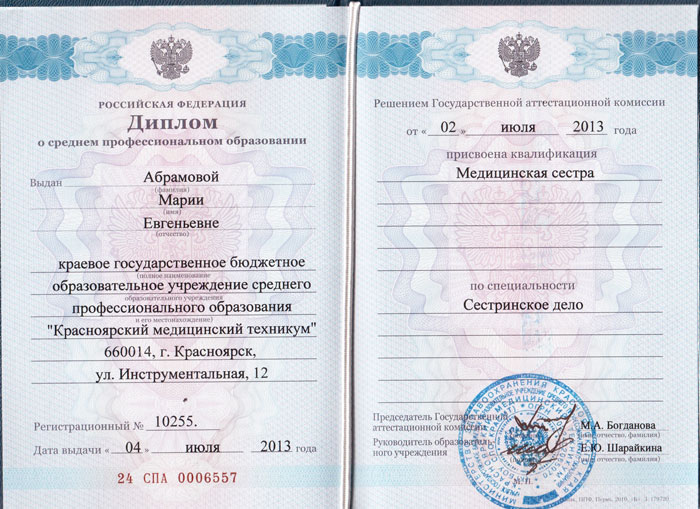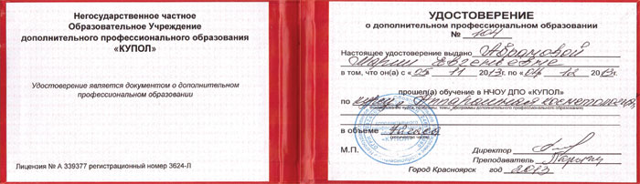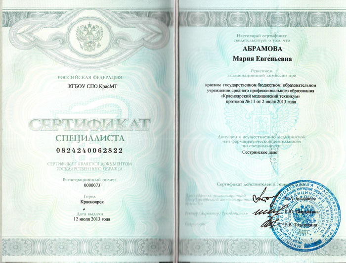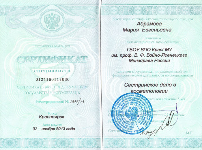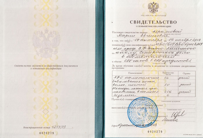 2013 г. – ИПО ГБОУ ВПО Крас ГМУ имени профессора В. Ф. Войно - Ясенецкого по циклу «Сестринское дело» в косметологии