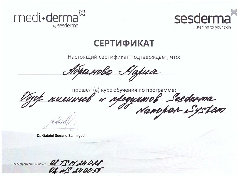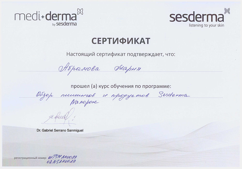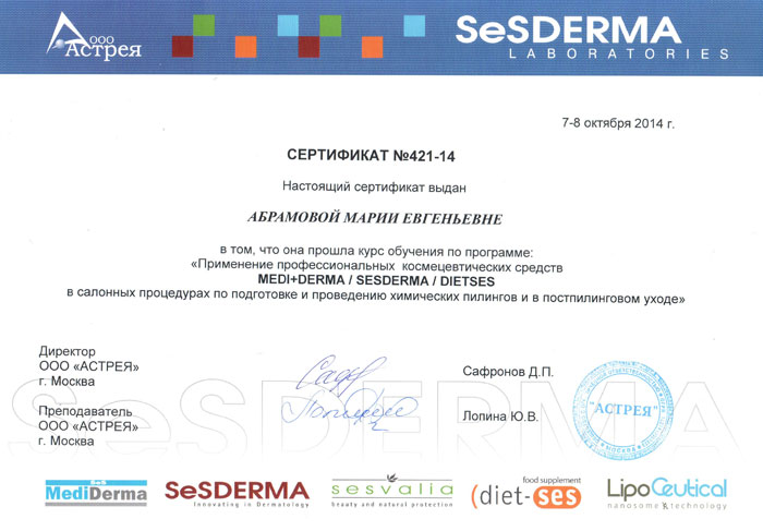 2014 г. - курс обучения по программе: «Применение профессиональных космецевтических средств MEDIDERMA, SESDERMA, SESVALIA, DIETSES в салонных процедурах по подготовке и проведению химических пилингов и в постпилинговом уходе в «Астрея» г. Москва.