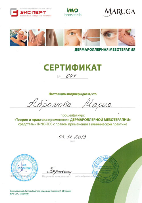 2013 г. – Курс «Теория и практика применения ДЕРМАТОРОЛЛЕРНОЙ МЕЗОТЕРАПИИ» средствами INNO-TDS с правом применения в клинической практике в Негосударственном частном Образовательном Учреждении, ДПО «Купол».
