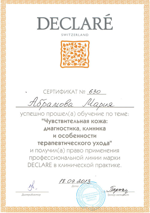 2013 г. – Обучение в Негосударственном частном Образовательном Учреждении ДПО «Купол» по теме: «Чувствительная кожа: диагностика, клиника и особенности терапевтического ухода».