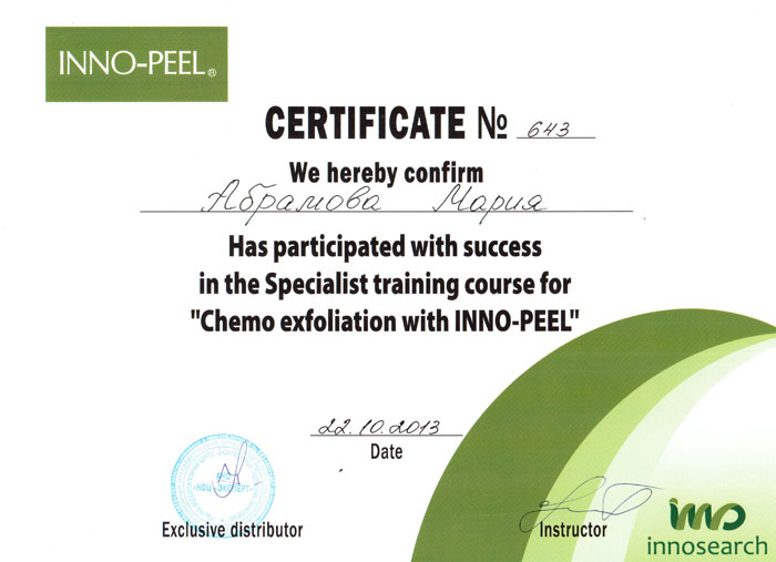 2013 г. – Курс по применению химических пилингов «Chemo exfoliation with INNO-PEEL» в АНО «НОЦ «ЭКСПЕРТ».