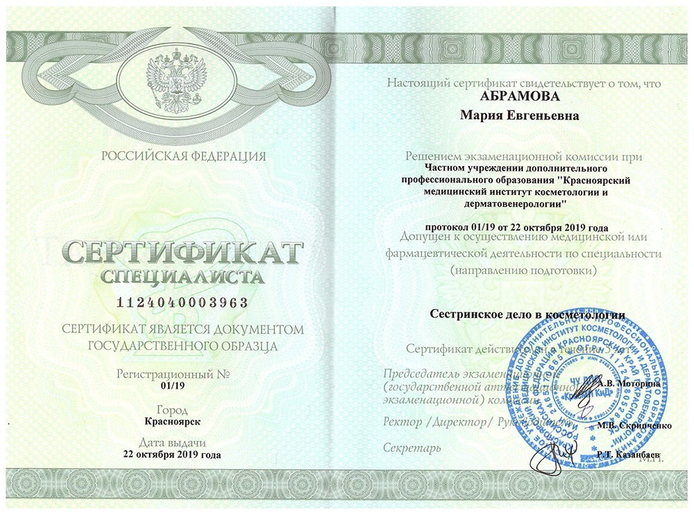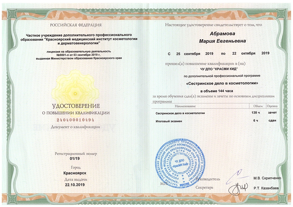 Октябрь 2019г., Красноярск, Частное учреждение дополнительного профессионального образования "Красноярский медицинский институт косметологии и дерматовенерологии" - повышение квалицикации в ЧУ ДПО "КРАСМИ КИД" по дополнительной профессиональной программе "Сестринское дело в косметологии"