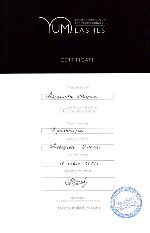 2014 г. - Курс по теме: "Ламинирование ресниц "Yumilashes" в ООО "Аrt et beaute".