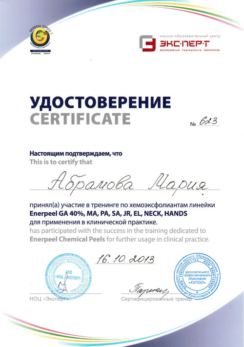 2013 г. – Тренинг по хемоэксфолиантам линейки Enerpeel GA 40 %, MA, РА, SA, JR, EL,NECK, HANDS для применения в клинической практике в Негосударственном частном Образовательном Учреждении ДПО «Купол».