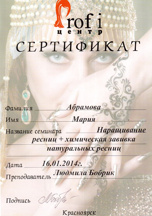 2013 г. – Курс по теме: «Наращивание ресниц +химическая завивка» в «Международной академии красоты «Татьяна».